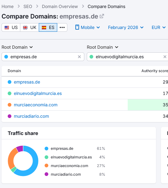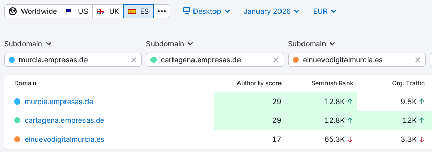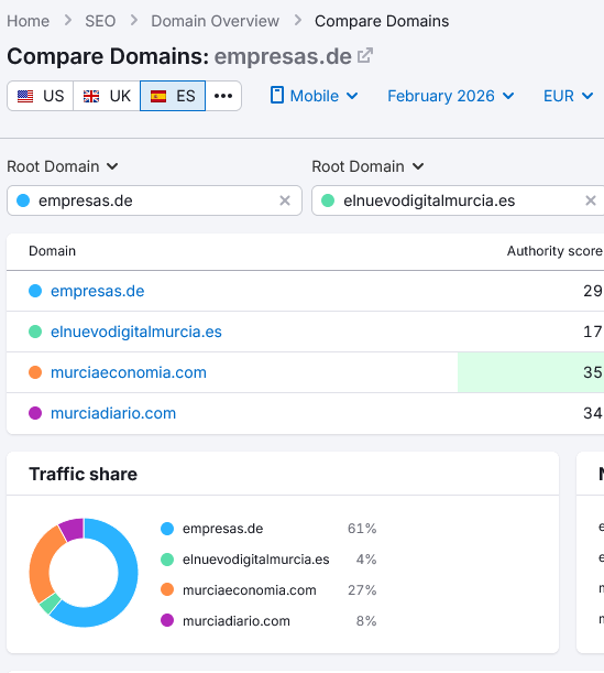 Mientras, Similar Web, Semrush, Ahrefs, Moz o cualquier otra herramienta similar (que no tiene la medición de tráfico de la competencia como función principal) que dan tanto dato contradictorio y en su mayoría perjudiciales para El Nuevo Digital Murcia, excepto, oh, casualidad, el que han recortado para su informe omitiendo partes interesantes, pero que dice lo contrario que la mejor de ese tipo de herramientas, Semrush, cuyos datos, por cierto, tampoco se me van a subir a la cabeza, a pesar de que digan que tenemos más tráfico que los otros tres periódicos de nuestra liga juntos, y aunque ese dato sea compatible con los oficiales.