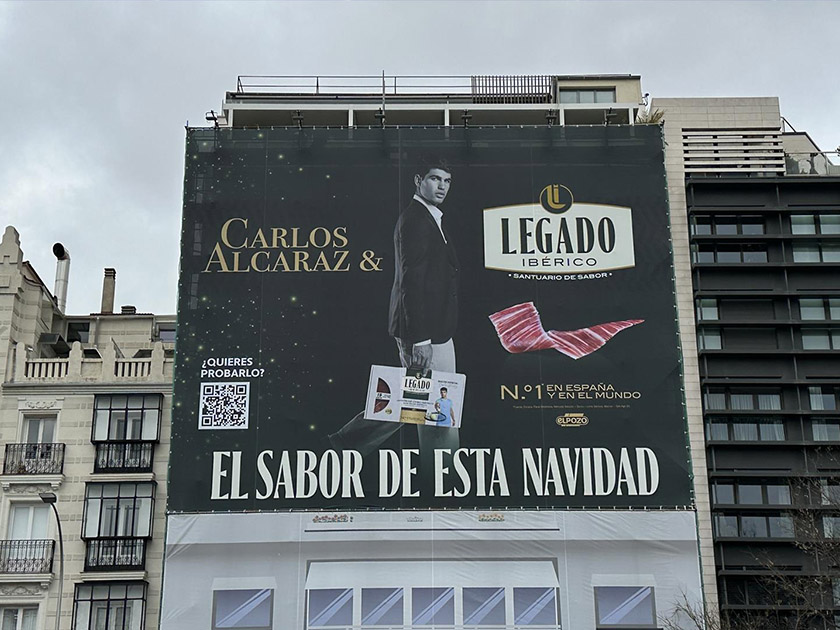 La marca Legado Ibérico, parte del grupo El Pozo Alimentación y líder en el mercado de productos ibéricos, ha desplegado en la calle Alcalá de Madrid una gran lona publicitaria para celebrar el Sabor de esta Navidad’. La lona, que estará visible hasta el 28 de diciembre, presenta al embajador de la marca, Carlos Alcaraz, sosteniendo el icónico maletín de jamón de Legado Ibérico, bajo el lema ‘El Sabor de esta Navidad’.
