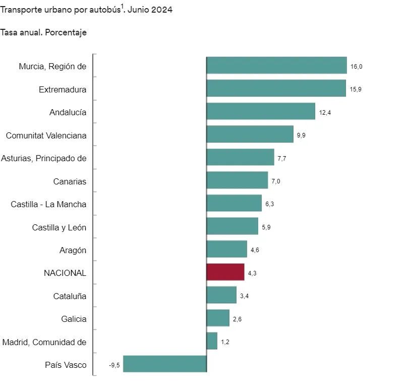 Tras la Región, se encuentra Extremadura (15,9%) y Andalucía (12,4%). El único descenso en el transporte por autobús se dio en País Vasco (-9,5%).