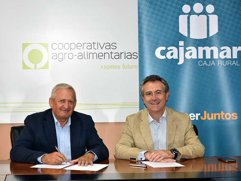 El presidente de Cooperativas Agro-alimentarias de España, Ángel Villafranca, y el presidente de Cajamar Caja Rural, Eduardo Baamonde, han suscrito un convenio de colaboración para la organización y desarrollo de actuaciones en común, relacionadas con las actividades y fines de las cooperativas agroalimentarias.