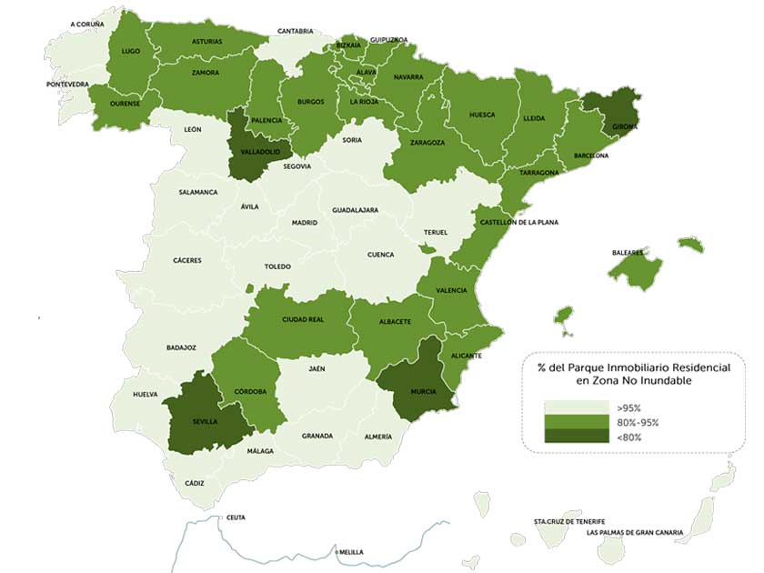 El ‘Mapa de riesgos del parque de viviendas en España 2024’ concluye que un 9% de las viviendas en España se encuentra en zonas con algún nivel de afectación a inundaciones, lo que equivale a cerca de 2,3 viviendas en cifras absolutas.