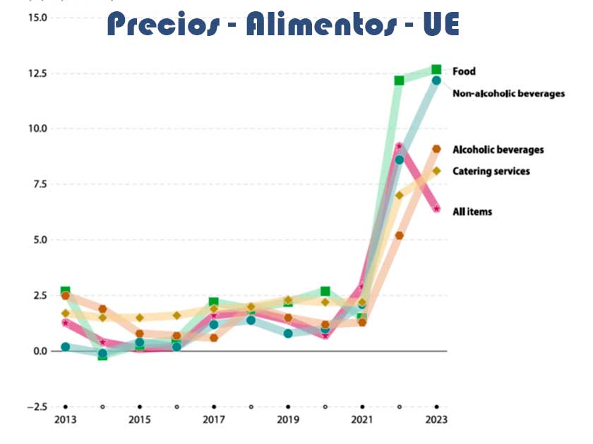 El incremento de los precios de los alimentos se ha producido especialmente durante 2022 y 2023, cuando el incremento de la gráfica fue exponencial, produciendo una crisis en el coste de la vida de los europeos. Concretamente, los alimentos incrementaron su coste un 41,2% en diez años, las bebidas no alcohólicas, un 30,5%,  los servicios de catering, un 34,3% y las bebidas alcohólicas, un 26,9%.