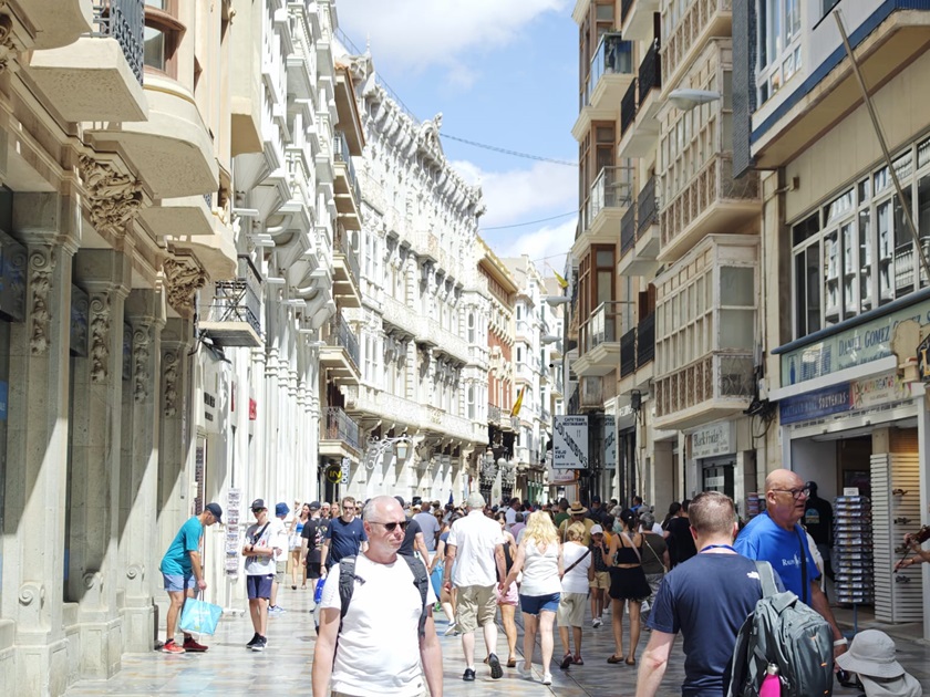 El centro de Cartagena rebosaba este caluroso viernes de julio lleno de turistas llegados a la ciudad a bordo del crucero más grande de todos los que harán escala este verano en el puerto. Se trata del buque Arvia, de la naviera P&O Cruises, que con sus 5.500 pasajeros ha dejado una estampa con calles y terrazas llenas.
