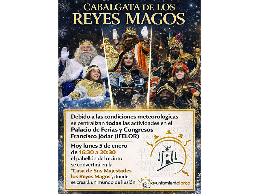 El Ayuntamiento de Lorca ha decidido trasladar la cabalgata de los Reyes Magos y el conjunto de actos previstos para este lunes al Palacio de Ferias y Congresos Alcalde Francisco Jódar (Ifelor) ante la previsión de lluvias, según ha informado el Consistorio en un comunicado.