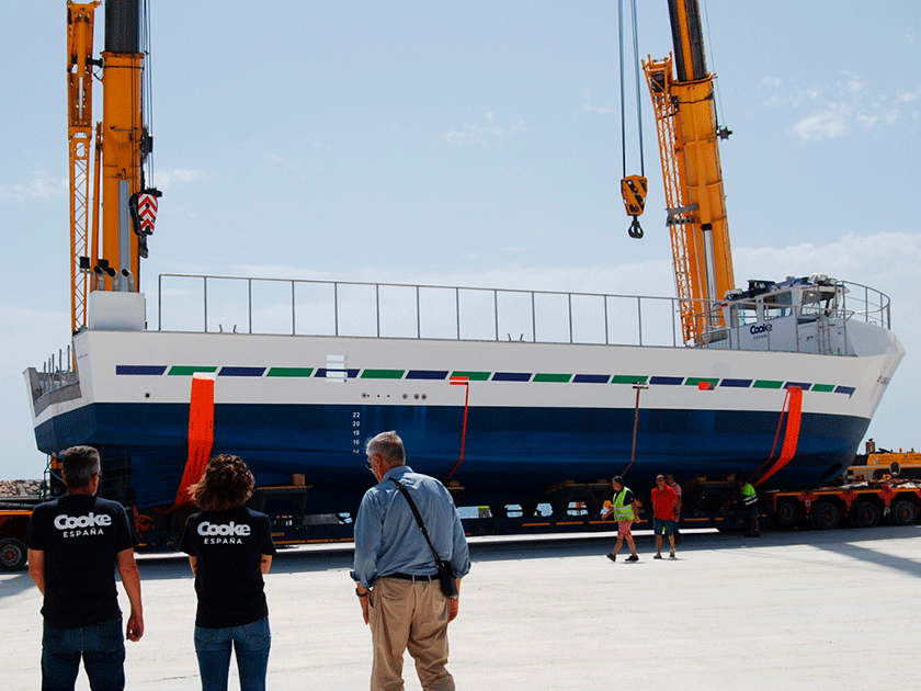 El primero de los cinco barcos de la serie monocascos polivalentes para la acuicultura de alta gama construido por Alcántara Systems y desarrollado por Cooke España por encargo de su filial Pescaviva Real S.L.U., el ‘Terreros II’, fue botado el 21 de julio del pasado año en el puerto de Carboneras. Este buque incluía las tecnologías más avanzadas para llevar a cabo todo tipo de operaciones relacionadas con la acuicultura.