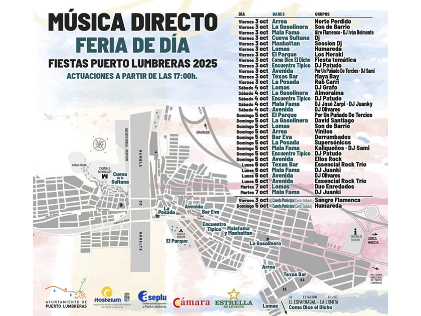Puerto Lumbreras celebrará del 3 al 7 de octubre la Feria de Día 2025 con un total de 36 conciertos en 14 bares y restaurantes, en el marco de sus fiestas patronales en honor a la Virgen del Rosario. El evento es organizado por el Ayuntamiento, en colaboración con la asociación de hosteleros Hostelum, la Asociación de Empresarios de Puerto Lumbreras (ASEPLU) y la Cámara de Comercio de Lorca y Puerto Lumbreras.