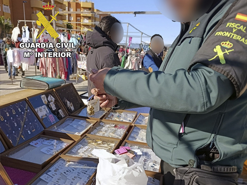 La Guardia Civil ha intervenido un total de 400 artículos falsificados en un puesto ambulante del mercadillo semanal de Puerto de Mazarrón. Entre los objetos incautados se encuentran joyas, relojes y carteras, cuya valoración asciende a los 116.000 euros, según ha informado la Benemérita.