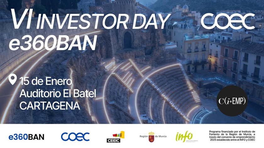 Será durante la sexta edición del ‘Investor Day’, la ya consolidada jornada de la Red de Inversores Privados e360BAN, liderada por la Confederación Comarcal de Organizaciones Empresariales de Cartagena (COEC), en colaboración con el Instituto de Fomento de la Región de Murcia (Info) y el Centro Europeo de Empresas e innovación de Cartagena (Ceeic).