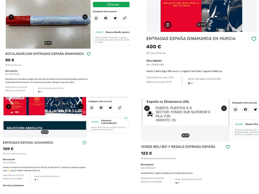 «3 entradas España-Dinamarca y un boli», por 2.100 euros, así como «Rotulador, con entradas España Dinamarca» o el clásico «Vendo boli BIC (por 123 euros) y regalo entrada España», son algunos de los anuncios que se pueden encontrar y que han causado una mayor indignación entre los centenares de aficionados que no han podido conseguir billetes por los cauces legales para el encuentro.