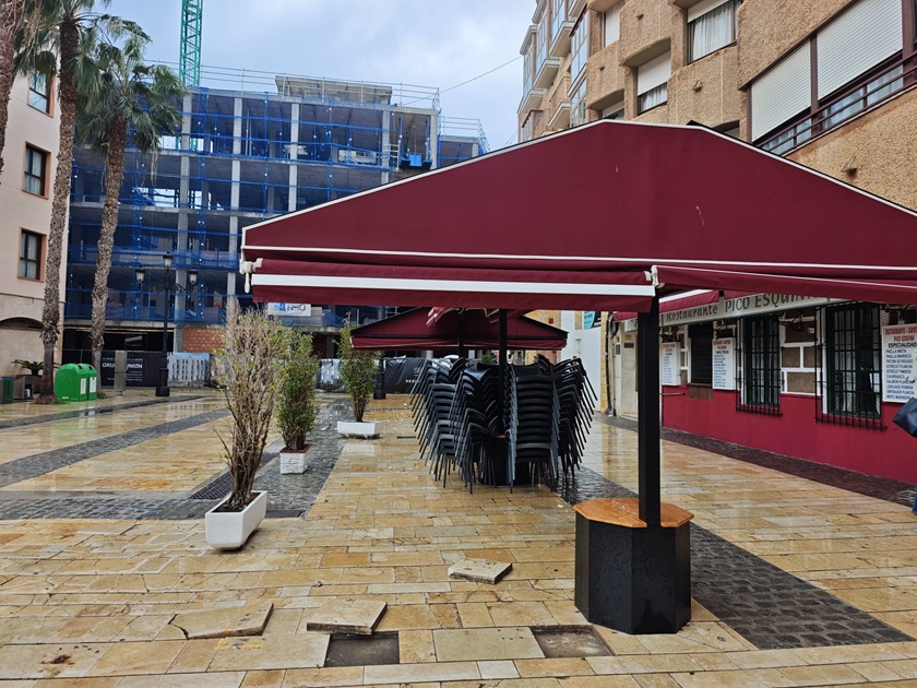 Los fuertes vientos dejan terrazas vacías y mobiliario caído en el centro de Cartagena