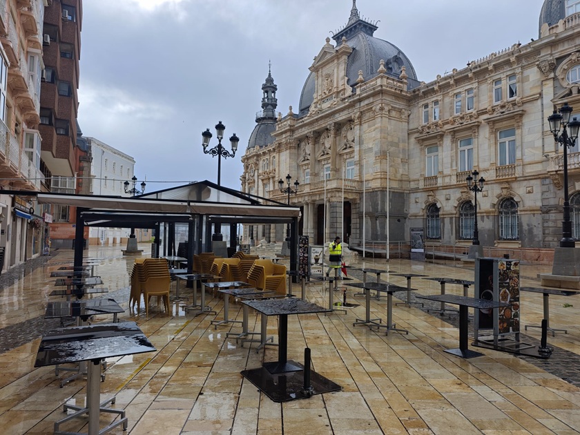 Este miércoles, los hosteleros del centro de Cartagena se han visto obligados a recoger sus terrazas ante la ausencia de clientes y la falta, durante las próximas semanas, de cruceristas. Así es el caso del conocido Pico Esquina o el pub Yellow Submarine, ambos junto al Palacio Consistorial, donde ha caído una farola sin causar daños personales en la Plaza José María Artés.