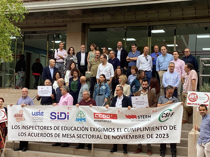 Los inspectores de Educación de la Región de Murcia se han vuelto a concentrar este lunes 13 de octubre a las puertas de la Consejería de Educación y Formación Profesional, para exigir el cumplimiento de los acuerdos adoptados en la Mesa Sectorial que se celebró el pasado 29 de noviembre de 2023 y la cobertura de los daños personales y materiales que puedan sufrir los inspectores en sus visitas a los centros educativos.