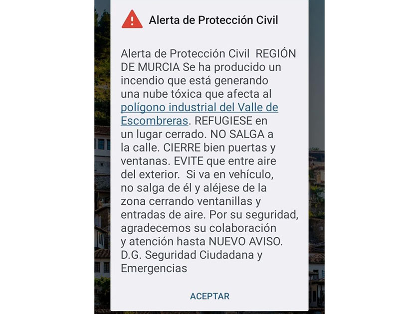 Mensaje del sistema Es-Alert enviado a los vecinos de Alumbres.