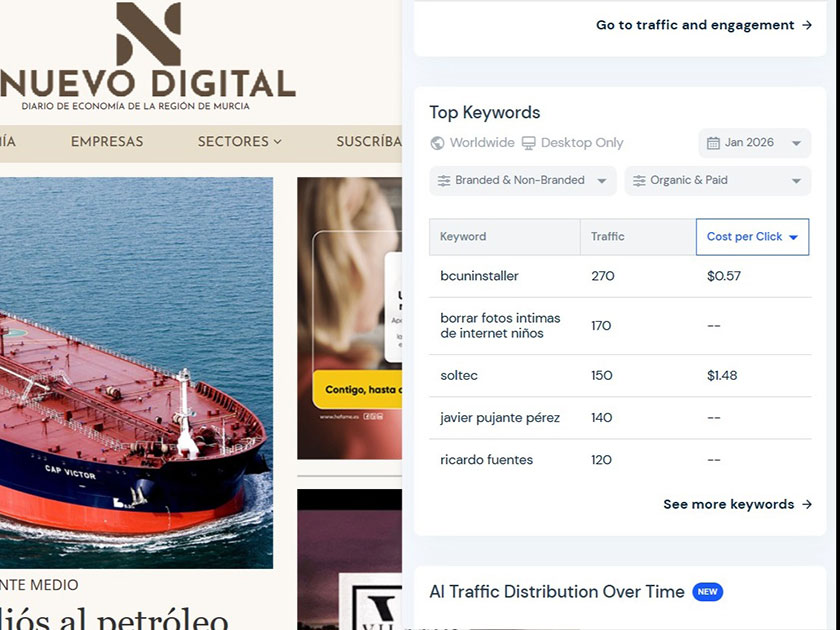 Un ojo entrenado puede saber si el tráfico de una web es real o artificial mirando determinados parámetros, o si los datos “estimados” son correctos. En ese mismo pantallazo dice que las primeras cinco fuentes de tráfico procedente de Google para El Nuevo Digital Murcia apenas le dan 800 visitas. De ahí a los cientos de miles de visitas de las que presumen hay un trecho muy largo, tráfico que, como explicaré luego, no sé de dónde saldrá. Pero lo más llamativo es que esa misma parte de abajo del pantallazo, en este caso de EmpresasdeCartagena nos da 2.000 visitas (solo la edición Cartagena, sin contar Murcia y Lorca), 2,5 veces EmpresasdeCartagena más que a El Nuevo Digital Murcia. Dato que, cuando menos, chirría.